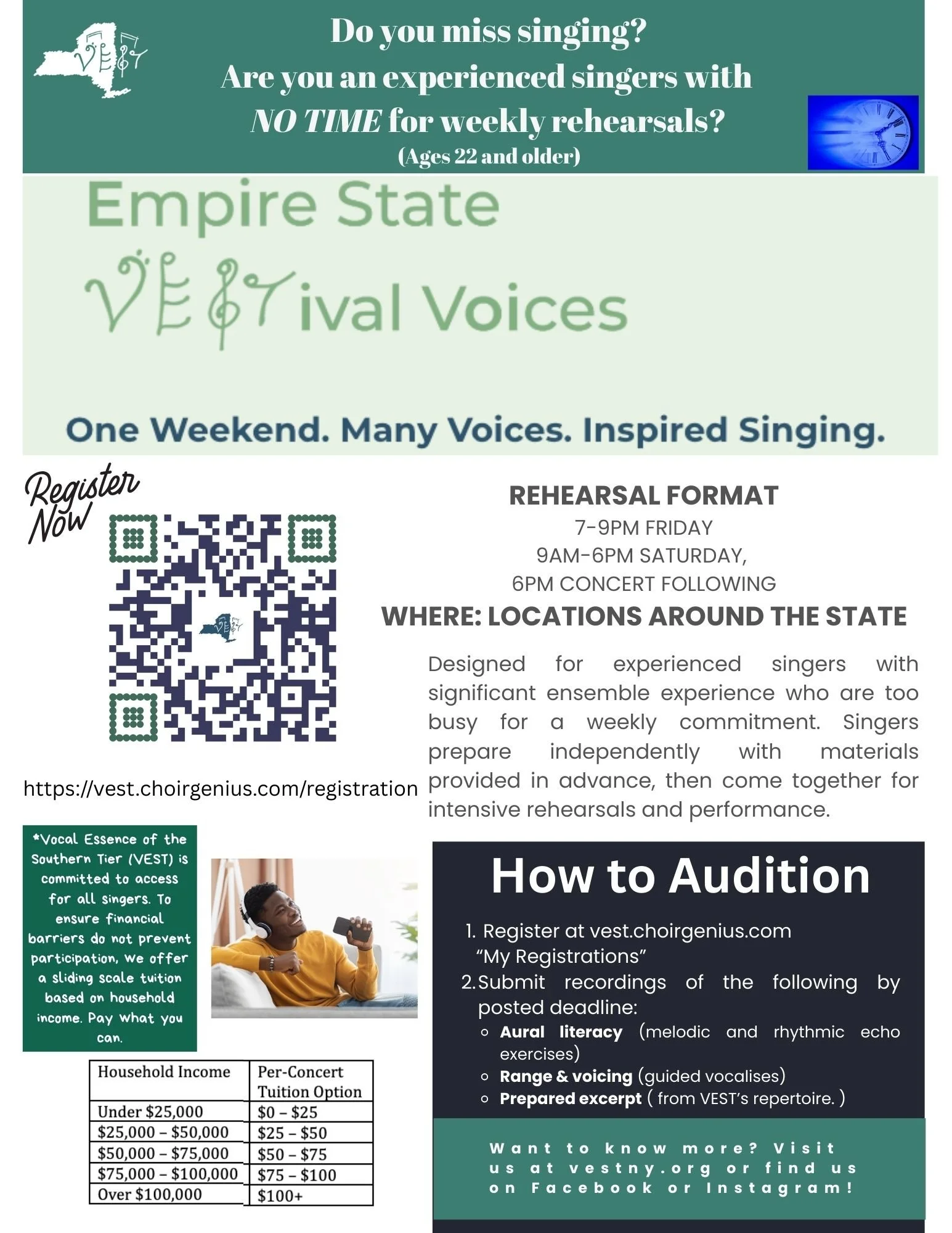 Vocal Essence of the Southern Tier (VEST) invites experienced adult singers to audition for our new semi-professional chorus, designed as a series of weekend intensives of high-level artistry, collaboration, and performance.