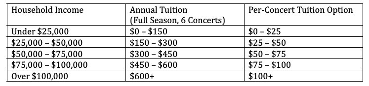 Below is our sliding scale for full-year participation (2 semesters) in weekly children and youth programs. For families with multiple ensemble members within the children and youth programs, there is a suggested 50% discount for each additional ensemble member. Full tuition applies to households with income above the 10% discount threshold. This tuition structure is based on an honor system.